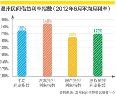 上圖是溫州民間借貸服務中心公布的每月利率指數(shù),目前6月的平均利率指數(shù)為1.3%,即月息平均為1.3%,年利率在15.6%左右,而當期銀行6個月到1年期的貸款利率為6%。