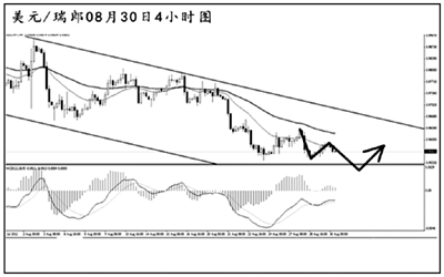 美元兌瑞郎在下降通道中部震蕩盤整,對前方的下跌進行修正。日線圖匯價已經(jīng)跌破了均線系統(tǒng)的依托,下方即將挑戰(zhàn)道氏低點支撐0.9425,跌破方可打開進一步的下跌空間。日線MACD仍然處于空頭動能充盈的階段,預(yù)計后市調(diào)整過后仍將以下行為主。