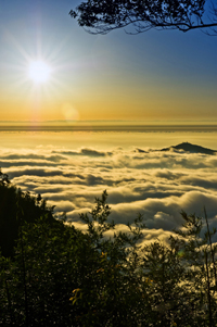 日出或薄暮天氣晴朗而有浮云時,阿里山經(jīng)常出現(xiàn)景色壯麗的云海。登上山頂平臺,放眼遠(yuǎn)眺,白云從山谷涌起,迎風(fēng)飄蕩,時而如汪洋一片,淹沒千山萬嶺,露在云海上的峰類、樹木好像一座座浮嶼;時而如大地鋪絮,足下白茫茫一片;時而如山谷堆雪,林海中山頭若隱若現(xiàn),頗似海市蜃樓。若是晴天,落日的萬道金光照射在云海上,閃耀出千萬種色彩,茶色、杏黃、寶藍(lán)、艷紅、碧綠等變幻無窮,更顯神秘。