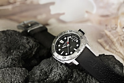 另一款式適合男女佩戴著。表殼直徑38mm,觸目的黑色表盤配以亮眼的精鋼表殼,夜光白色刻度在黑色表盤上更為突出,同樣地,特大的日歷視窗設(shè)于3時(shí)位置。這個(gè)款式一樣配備橡膠材質(zhì)及精鋼表帶以供選擇。
