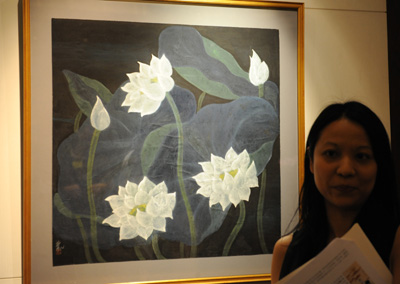 日前,香港蘇富比拍賣行舉行2012年秋季中國書畫拍賣品預(yù)展,展出部分即將拍賣的書畫作品,拍賣會將于10月8日在香港會議展覽中心舉行。圖為蘇富比工作人員在介紹即將拍賣的林風(fēng)眠畫作《白荷》,估價100萬至150萬港元。
