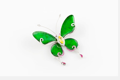 在清晨明亮的光線下,晶瑩的露珠在芳草上閃爍,更顯清新脫俗、嬌美可愛(ài);翅膀閃耀著透明銀光的蝴蝶,在花間草葉上飛舞翩阡!熬G茵”系列透過(guò)精湛的切割技術(shù)與藝術(shù)設(shè)計(jì),轉(zhuǎn)化為自然界中姿態(tài)曼妙的造物,呈現(xiàn)輕盈婉轉(zhuǎn)的線條;讓翡翠珠寶不只適于配戴,更成為現(xiàn)代藝術(shù)珍藏。