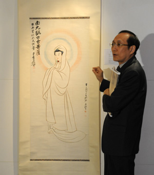 展出畫作中,有一幅1941年設(shè)色紙本立軸《白描觀音像》,為張大千初入敦煌時所畫,與深受敦煌畫法影響的后期作品在風(fēng)格上有明顯差別,具有較高的藝術(shù)收藏價值。畫作被大師在上世紀60年代題款贈友,畫與款年代相差十幾年,也成為趣事一樁。具有較高價值的還有1949年張大千初到臺灣時,為答謝友人之子幫忙安頓而寫贈的水墨紙本鏡框《自畫小像》,僅有11厘米乘7.8厘米大小,是現(xiàn)今存世尺幅最小的張大千自畫像。