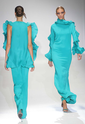 時(shí)裝周首日秀場(chǎng)上,古奇品牌2013春夏時(shí)尚女裝秀最為搶眼。本季新品保持了上一季流行熱點(diǎn)——注重色彩,大面積的玫紅、草綠、寶石藍(lán),輔之以線條流暢的大花邊,褶皺,把女性的玲瓏線條勾勒得淋漓盡致,蛇紋、豹紋大幅回歸,但經(jīng)過(guò)新設(shè)計(jì),張揚(yáng)中加入了優(yōu)雅的元素。