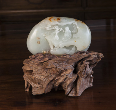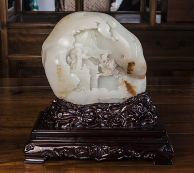 圖為:揚州玉雕名家顧銘作品和田玉籽料《把酒問青天》