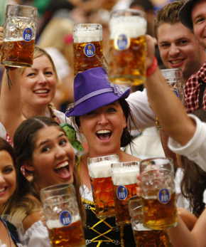 要想感受慕尼黑啤酒節(jié)的熱鬧氛圍,最佳的場所莫過于帳篷里。啤酒節(jié)無需門票,一個個帳篷在客滿之前都能按照先后順序隨意進(jìn)入。偌大的帳篷里一張張長條坐凳緊密相接,精心裝扮的人們只好背靠背地坐下喝酒。一個慕尼黑本地人告訴記者,啤酒節(jié)對年輕人有著無與倫比的吸引力。在啤酒帳篷里,目光所及之處都是三五成群聚會的年輕男女。這無疑又是兜售的良機(jī)。啤酒自不必說,一杯接著一杯地上,然后總要來點(diǎn)下酒菜吧。女服務(wù)員滿臉笑容,現(xiàn)場推銷起帽子和玫瑰花。在酒精的作用下,和著音樂,對著心儀的女孩,年輕的男孩自然難以捂緊錢包。