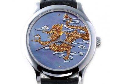 然而,對(duì)外國(guó)畫(huà)家而言,中國(guó)龍實(shí)在不容易畫(huà),不論是其身形、麟片、須角,以至神龍?zhí)焐耐渲,都難度甚高,所以,按畫(huà)作本身而言,品牌今次的制成品只可說(shuō)是不過(guò)不失。但論到在珍珠貝母表盤(pán)上作微型彩繪,品牌絕對(duì)是第一把好手,因?yàn)槊繅K貝母的紋路都有不同,再配合全人手繪畫(huà)的圖案,并要做到纖毫畢現(xiàn),在工藝難度上又搶回不少分?jǐn)?shù)。此外,貝母獨(dú)有的靈動(dòng)光澤,為表盤(pán)做出天然的色彩漸變效果,極具騰云駕霧的意景。