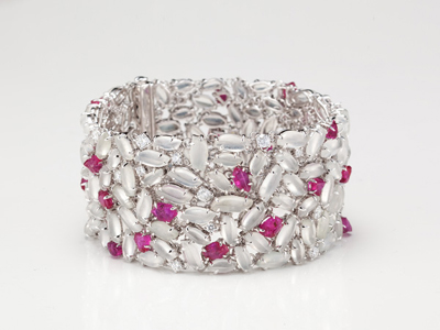 突破以往單一翡翠材質(zhì)的設(shè)計,以頂級緬甸天然紅寶石納入珠寶設(shè)計元素,將不同切割的冰種翡翠鑲嵌一起,保有玉質(zhì)清澈剔透之感,綴有以露面立體切割的紅寶石,呈現(xiàn)透白翡翠與露面紅寶交錯的獨特魅力,充滿現(xiàn)代前衛(wèi)的氣息。Rich