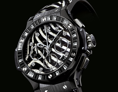 斑馬紋如同白晝與黑夜合二為一,輕巧與精細(xì)的氣息迎面撲來(lái)。這是一款擁有41毫米直徑表盤(pán)及黑色陶瓷表圈的超女性化腕表,表圈鑲有48顆黃水晶及狹長(zhǎng)方形尖晶石,8顆鉆石嵌于斑馬紋表盤(pán),熠熠生輝。腕表搭載了自動(dòng)機(jī)械計(jì)時(shí)碼表機(jī)芯,防水深度達(dá)100米,黑色橡膠表帶上縫制有斑馬紋小牛皮,兼具舒適與靈巧,必能令時(shí)尚達(dá)人心潮澎湃。BIG
