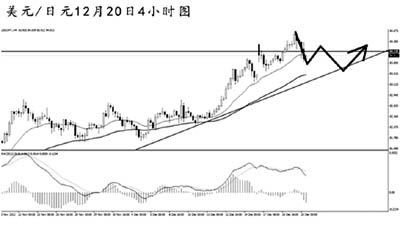美元兌日元向日線圖前方高點(diǎn)阻力84.15發(fā)起沖擊后回落,此后再度創(chuàng)出新高,顯示出日元目前的疲弱。但此次新高未能打開過多的上漲空間。本周四上午,日本央行如期宣布擴(kuò)大資產(chǎn)購置規(guī)模,日元走勢(shì)震蕩,短線匯價(jià)再度回落,預(yù)示著匯價(jià)沖擊85.50的阻力還需要一定的時(shí)間。