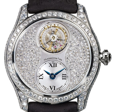 格拉蘇蒂深知女性對于鉆石所擁有的、幾乎是出于本能的迷戀。當(dāng)一支擁有復(fù)雜陀飛輪的格拉蘇蒂腕表表盤綴滿繁星般的碎鉆,有幾人能夠掩住驚艷的嘆息?技藝與奢華并存,即是格拉蘇蒂女款小夜曲陀飛輪腕表。