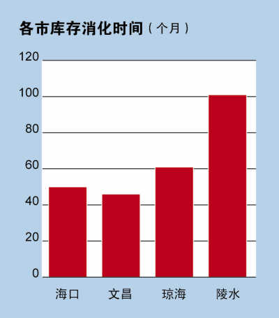 根據(jù)海南克爾瑞的統(tǒng)計(jì)數(shù)據(jù),海南樓盤(pán)庫(kù)存量最低的是三亞市,截至2012年11月底,三亞仍需要2年消化完。而其他重點(diǎn)城市如?跇鞘袔(kù)存消化周期長(zhǎng)達(dá)50個(gè)月,文昌需要46個(gè)月,瓊海需要61個(gè)月,庫(kù)存最高的的陵水則需要101個(gè)月。