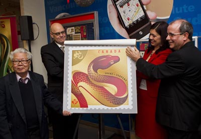 近日,為迎接中國農(nóng)歷癸巳蛇年,加拿大郵政總局正式發(fā)行蛇年生肖郵票,包括首日封、紀(jì)念封、國內(nèi)及國際版郵資郵票等。