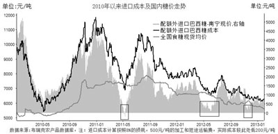 北京中期分析稱,盡管國內(nèi)對進口食糖實施配額管理,但是一旦國內(nèi)外食糖價差過于懸殊,即使按50%的配額外稅率進口也有利可圖,在2012年4至6月就曾持續(xù)出現(xiàn)過上述情況,結(jié)果造成進口糖數(shù)量大增,嚴(yán)重沖擊了國內(nèi)食糖市場。