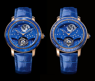 的機芯覆有藍色涂層,飾以45顆鉆石星座(0.24克拉)(環(huán)狀凸緣:11顆鉆石,表盤:34顆鉆石),如鹿豹座、英仙座、仙后座、大熊座、小熊座,表盤中心是北極星的相對位置。