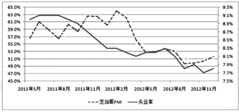 目前來看,美國經(jīng)濟(jì)正處于穩(wěn)步復(fù)蘇階段。在連續(xù)實(shí)施量化寬松政策之后,美國一些重要經(jīng)濟(jì)數(shù)據(jù)顯示其復(fù)蘇勢頭良好,PMI指標(biāo)開始回升,已連續(xù)兩個(gè)月處于50榮枯分界點(diǎn)之上;失業(yè)率也持續(xù)下降,并處于低位運(yùn)行;而投資者普遍關(guān)注的財(cái)政懸崖,也如預(yù)期般得到了緩解,暫時(shí)不會(huì)對商品市場構(gòu)成沖擊。