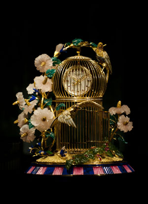 香港蘇富比藝術(shù)空間當(dāng)日預(yù)先展出多件展品,其中百達翡麗的“金貝與珍珠”和“喜鵲聚寶鳥巢”兩件座枱鐘,卡地亞“火鶴與蓮花”機械座枱鐘最受矚目。