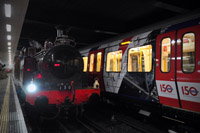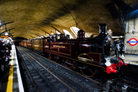 隨著夜色中的一聲汽笛,一輛19世紀(jì)蒸汽機(jī)車?yán)S多利亞時代的木制車廂駛?cè)雮惗氐罔F穆爾蓋特車站,白色蒸汽從紅色車頭上冒出來,煤氣味在空中彌漫,這一幕似乎把人們帶回到了1863年。那一年1月9日,倫敦開通了世上第一條地鐵線路。