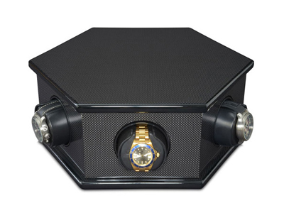 頂蓋和所有的垂直面由碳纖維板制成,表面其他部分經(jīng)黑色鋼琴烤漆處理。手表上鏈盒還可以進(jìn)行堆加擴(kuò)展到四層,一共24個(gè)獨(dú)立的動(dòng)力上鏈位。