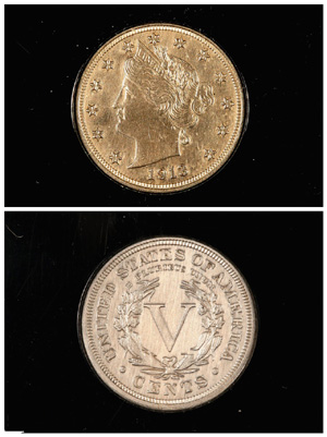 自由女神頭像5美分硬幣是1883年到1912年間美國發(fā)行流通的硬幣,1913年停產(chǎn)。從1913年開始,硬幣上的圖像換成了人們喜愛的美國野牛。據(jù)稱,費城鑄幣局一名工人1912年底私自鑄造了5枚帶有自由女神頭像的5美分硬幣,并改造模具,印上了1913年字樣。
