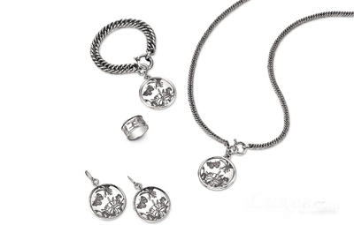 長項(xiàng)鏈和采用較厚銀鏈的手鏈均搭配了雕刻花卉圖案的圓形墜飾。耳墜也由兩個(gè)圓形墜飾組成,戒指則采用寬版設(shè)計(jì),同樣飾有花卉圖案。