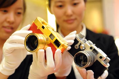 為紀(jì)念萊卡相機(jī)誕生100周年,香港仕宏拍賣有限公司將于6月22日在香港舉行萊卡百年精典收藏相機(jī)拍賣會(huì),屆時(shí)將拍賣198款從世界各地收集來的萊卡稀有藏品。圖為在北京舉行的新聞發(fā)布會(huì)上,工作人員在介紹即將拍賣的中華人民共和國(guó)建國(guó)60周年紀(jì)念版萊卡相機(jī)和萊卡IIIG/IIIF相機(jī)。
