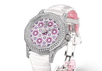 71顆粉紅色藍(lán)寶石(約0.23卡)丶14顆紫色藍(lán)寶石(約0.05卡)及73顆鉆石(約0.21卡),重塑表面的花卉圖案,并透過表底剔透的藍(lán)寶石水晶玻璃,綻放閃爍光彩。表背外圍的白金制部分飾有人手雕花圖案,令精致的花瓣和花冠更加突出,設(shè)計(jì)主題更加活靈活現(xiàn)。