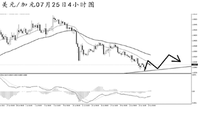 美元兌加元利用一周的時間構(gòu)筑起一個旗形中繼的調(diào)整形態(tài),此后匯價延續(xù)短線的跌勢。目前匯價運(yùn)行到了日線圖上升趨勢線的支撐位,能否有效跌破此線成為后市繼續(xù)下行的關(guān)鍵。小時圖MACD的底背離信號十分明顯,但均線系統(tǒng)保持壓制的狀態(tài),只有站穩(wěn)在1.0250下方才能考慮繼續(xù)入場做空。