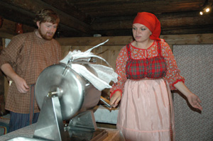 卡佳邀請我們?nèi)ニ易隹,并演示了黃油制作工藝。她拿出一個類似滾筒的機器,把一大桶牛奶倒入滾筒里,在封口處鋪上紗布后密封,就開始不停地轉(zhuǎn)動手柄。這是一道耗費體力和時間的工序,每個人都得到了親自體驗的機會。伴著卡佳和鄰居的動聽歌曲,滾筒在眾多人手中交替轉(zhuǎn)動,十幾分鐘后,打開圓筒,倒出剩余牛奶,留在滾筒里的固體就是黃油了,而倒出的那一部分液體,就是脫脂牛奶。正當筆者驚詫于黃油如此神奇地出現(xiàn)時,卡佳說,她們使用的是經(jīng)過加工的放置兩天后的半成品牛奶,制作黃油的整套工序其實是非常復雜的。