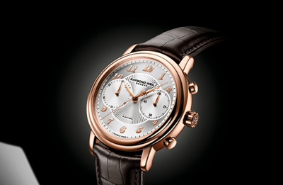 計時裝置位于三點鐘和九點鐘位置,指針是雷蒙威最經(jīng)典的款式,鍍以玫瑰金,和金色的數(shù)字交相輝映。表殼直徑為41毫米,最后搭配經(jīng)典的棕色鱷魚皮表帶,賦予高貴陽剛之氣。