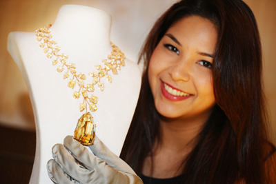 高級珠寶商懋琬為10月11日至15日舉行的新加坡珠寶節(jié)向媒體展示鉆石項鏈,項鏈墜為重達(dá)407.48克拉的天然黃鉆“無與倫比”。