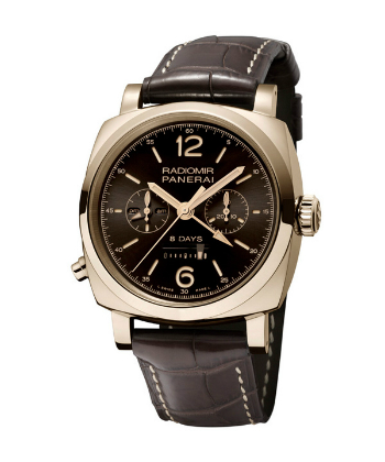 Monopulsante 8 Days GMT Oro Bianco 8日動力儲存兩地時間單按把計時白金腕表。兩枚全新腕表完美揉合Radiomir