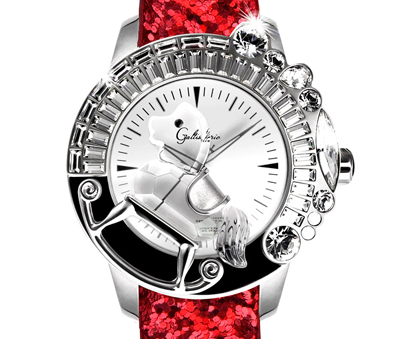 迦堤品牌的標(biāo)志,在神奇木馬的設(shè)計意念中,加上極為炫目的Bling Bling閃爍的皮帶,令人目不暇給;再加上表殼著Galtiscopio招牌「GP
