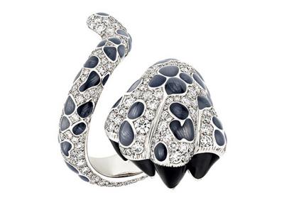 Castellane將漫天飛雪灑落豹爪,除了將原來的黃K金款式鋪鑲上鉆石外,也推出精斂的白K金鑲鉆款式;每只戒指鑲嵌4.25克拉鉆石,兩款分別以灰色彩漆與巧克力色彩漆著點上豹紋,每個斑點更再刷上透明漆增加光澤與神秘感,黑色爪甲周圍的金屬更刻勒上溝紋以摹繪豹的指毛。