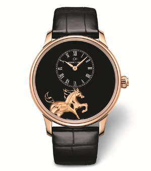 2014年,中國(guó)迎來(lái)馬年,馬不僅是活力與勇氣的象征,更是今年雅克德羅(Jaquet Droz)生肖腕表的主角。該品牌推出的三款專(zhuān)屬腕表皆由雅克德羅的手工藝大師采用獨(dú)一無(wú)二的精湛工藝打造而成。鐫刻、微繪……每一匹駿馬的肌理、馬鬃都刻畫(huà)得非常細(xì)致,惟妙惟肖。表盤(pán)上的駿馬矯健俊逸,姿態(tài)瀟灑,仿佛脫離了韁繩的束縛,在遼闊的原野上掣風(fēng)而馳。