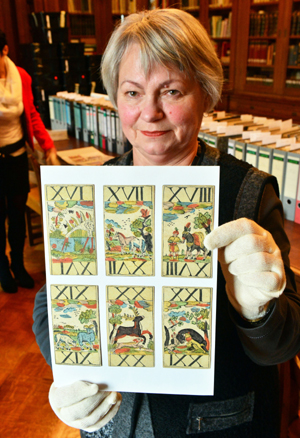 1月16日,德國阿爾滕堡撲克牌博物館重金收購某私人收藏的約2000副撲克牌,其中部分傳自16、18世紀(jì)和19世紀(jì)初期。圖為撲克牌專家雷娜特·賴因霍爾德展示一副大約1700年的動(dòng)物塔羅牌。