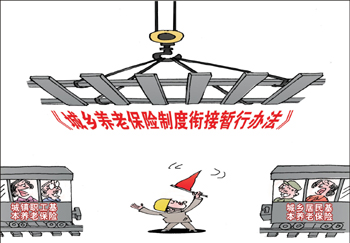 銜接 人力資源和社會保障部2月26日發(fā)布消息稱,經(jīng)國務(wù)院同意,人社部、財(cái)政部近日聯(lián)合印發(fā)了《城鄉(xiāng)養(yǎng)老保險(xiǎn)制度銜接暫行辦法》。這是繼國務(wù)院統(tǒng)一城鄉(xiāng)居民基本養(yǎng)老保險(xiǎn)制度之后出臺的又一項(xiàng)重要政策,主要是解決城鎮(zhèn)職工基本養(yǎng)老保險(xiǎn)與城鄉(xiāng)居民基本養(yǎng)老保險(xiǎn)制度兩大制度的銜接問題。新華社發(fā) 蔣躍新/作 |
