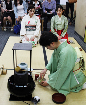 筆者參觀了2013年在此舉辦的第5屆世界茶節(jié)評比出的獲獎茶葉和展出的各國傳統(tǒng)茶具和創(chuàng)新茶具。當(dāng)?shù)夭枨f雅正庵還表演了“切茶壺口”儀式。“切茶壺口”是每年11月茶莊開始飲用當(dāng)年的新茶時(shí)舉行的儀式。當(dāng)年4月下旬開始采摘的新茶用紙包成兩根手指粗的小捆,裝入上小下大的壇形壺中封好,到楓葉始紅時(shí)點(diǎn)茶師用刀切開壺口,取出來品嘗。雅正庵的女茶師用木托盤捧著剛“出壺”的新茶和寫在宣紙上記載著茶品種和采摘日期的“茶入日記”到筆者面前,雖隔著紙,但茶香撲面而來,沁人心脾。