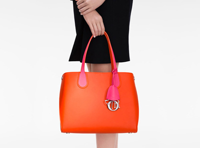 這款手袋著重于色彩的組合,所有顏色皆精心挑選搭配。兩片撞色的皮革互相粘和,或補色或?qū)Ρ龋钆涑龈鞣N摩登變化。手提袋上標志性的