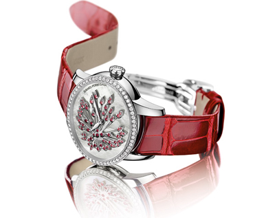 黑色人手打磨縞瑪瑙表盤上鑲73顆圓鉆;白色珍珠貝母表盤微微染灰并鑲73顆粉紅/紅色藍寶石,后者挑選極為嚴格,以達到悅目漸變色效果;兩款設計裝配微拱葉形指針,突顯其線條份量及金屬質感。