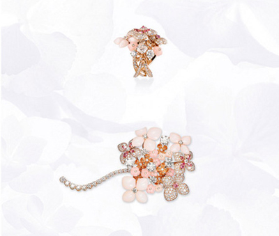 純凈白色的色調(diào)之中暈染一抹象征剛萌芽情懷的粉嫩色調(diào),寶石變成為一朵朵花卉,當(dāng)繡球花展開,便成為無數(shù)由粉紅碧璽組成的花朵,玫瑰金上是精雕細(xì)琢而成的蛋形蛋白石和粉紅色藍(lán)寶石。純凈的美鉆巧妙地結(jié)合彩色寶石,展示珍貴寶石的浪漫一面:一枚盛開著的繡球花戒指,一枚仿如隨風(fēng)搖動(dòng)的胸針,一枚優(yōu)雅精致的神秘腕表,或一條可轉(zhuǎn)化成短項(xiàng)鏈和手鏈的多功能長(zhǎng)項(xiàng)鏈。