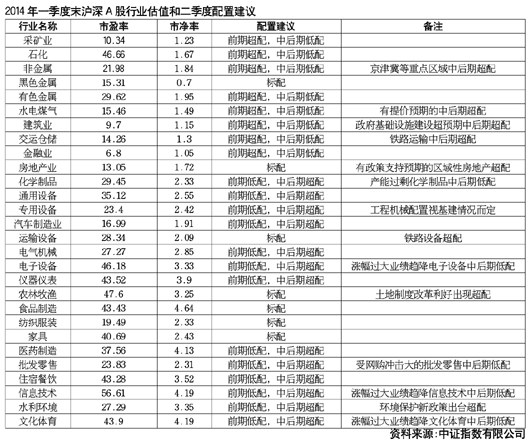 2014年二季度前期,建議適當(dāng)超配金融、有政策支持預(yù)期的區(qū)域性房地產(chǎn)和上游行業(yè),低配中游制造行業(yè)和下游消費(fèi)行業(yè);二季度中后期,建議低配金融房地產(chǎn)和上游行業(yè),超配中游制造行業(yè)和下游消費(fèi)行業(yè)。對(duì)個(gè)別行業(yè)也有例外建議。