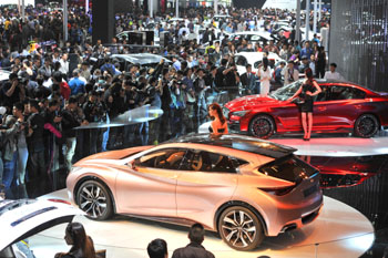 4月21日,在2014(第十三屆)北京國際汽車展覽會上,參觀車展的觀眾如潮,本次共展示車新能源車79臺,再次刷新北京車展的紀錄。記者 李文明