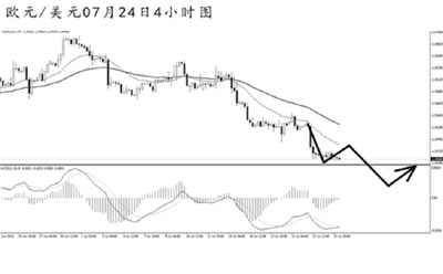 歐元兌美元保持回落的態(tài)勢(shì)。4小時(shí)圖下跌趨勢(shì)保持完好,雖然短線沒(méi)有構(gòu)筑出良好的次級(jí)趨勢(shì)調(diào)整,但預(yù)計(jì)歐元小幅反彈之后仍將繼續(xù)走低。