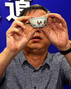 7月19日,收藏家劉益謙正在展示明代“斗彩雞缸杯”。當(dāng)日,劉益謙攜2.8億港元拍得的明成化“斗彩雞缸杯”從香港返回上海,并隨即將之入庫上海西岸藝術(shù)品保稅倉庫,此舉標(biāo)志著最重要中國(guó)瓷器之一回歸中國(guó),并成為上海龍美術(shù)館的鎮(zhèn)館之寶。據(jù)悉,明成化“斗彩雞缸杯”4月8日在香港蘇富比工藝品拍賣會(huì)上,以2.8124億港幣成交,刷新中國(guó)瓷器世界拍賣紀(jì)錄。記者