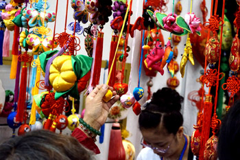 10月12日,中國非遺博覽會上琳瑯滿目的徐州香包吸引了不少顧客。 10月10-13日在山東濟南舉行的第三屆中國非物質(zhì)文化遺產(chǎn)博覽會上,國家級非遺項目徐州香包代表性傳承人井秋紅展示了她縫制精美的香包作品,觀者如云。香包,又稱“香囊”,“香布袋”,是漢族傳統(tǒng)的民間藝術(shù)品,制作和佩戴香包的習(xí)俗在中國由來已久。徐州香包造型上以新、奇、美、真為特色,形狀敦實淳樸,色彩對比強烈,有較高的觀賞、收藏價值,成為國家非物質(zhì)文化遺產(chǎn)之一。