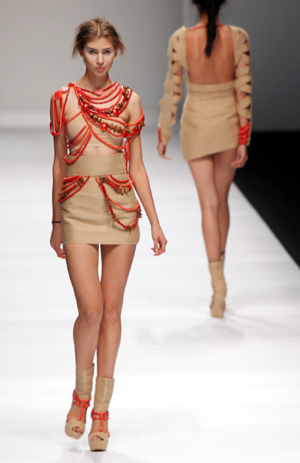 10月21日,模特在演繹大學(xué)生設(shè)計(jì)師的服裝秀。當(dāng)晚,IFA Paris中法埃菲時(shí)裝設(shè)計(jì)師學(xué)院“ACTIVE CALM動(dòng)·靜”專場(chǎng)時(shí)裝秀登陸2014上海時(shí)裝周。整場(chǎng)“秀”的服飾由學(xué)生自己設(shè)計(jì),從時(shí)尚人文的“動(dòng)與靜”切入,引出畢業(yè)生們對(duì)于“摩登幻想”“新部落文明”和“運(yùn)動(dòng)態(tài)度”三大分支的闡釋。