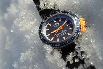 Sub令人驚艷的500米防水來自于在表冠上創(chuàng)新的加入鎖緊防水圈及避震防水圈;而能成為陪伴Redl冰下潛水的重要關(guān)鍵是裝置獨(dú)特可滑動(dòng)的表冠保護(hù)蓋確保腕表在極度寒冷的環(huán)境下仍能順利運(yùn)作。這只Hydro