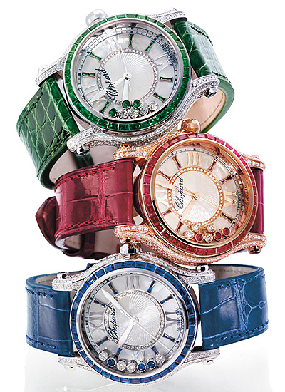 Sport系列極具現(xiàn)代風(fēng)格,表圈鑲嵌長方形切割紅寶石、藍(lán)寶石和祖母綠,凸顯有力線條。這些寶石還裝飾著表盤時標(biāo)、表冠和凸圓型裝飾。鱷魚皮表帶采用艷麗色彩,與妝點(diǎn)腕表的寶石交相輝映。18K白金表殼和珍珠母貝表盤的中央都鑲嵌著明亮式切割鉆石。另外,著名的“Happy
