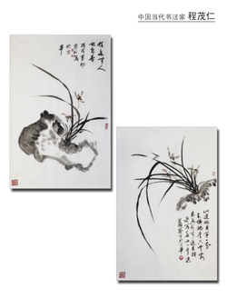 老四程茂仁,1947年生于北京,自幼受家庭的熏陶,隨父習(xí)畫。后又受教于著名書法家黃高漢先生,臨習(xí)《柳公權(quán)玄秘塔》、《顏真卿多寶塔》等碑帖,并得其父好友蕭勞、王遐舉先生的教誨,走上了學(xué)習(xí)書法之路。為了更好地學(xué)習(xí)和交流書法藝術(shù),1998年退休后,他從山東回到北京,專心致志搞書法。回到北京后,他遍訪北京書法名家,虛心求教,廣泛交流,受益頗多。2002年,又拜歐陽中石先生為師,得到先生的親自教誨,更使其書法平添了幾多神韻。